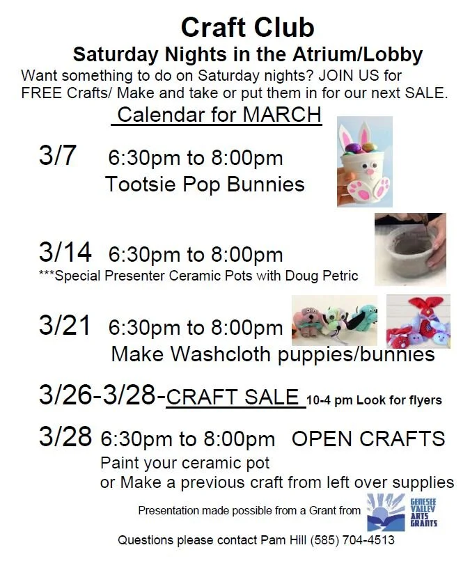 Resident Craft Club Night is a weekly program at the Livingston County Center for Nursing and Rehabilitation held at 6:30 - 8 pm where the residents and others can make and create and learn for free to give them an opportunity to keep busy, meet new people, keep them active, motivated and independent while learning more visual Arts and Crafts, while improving hand eye coordination.