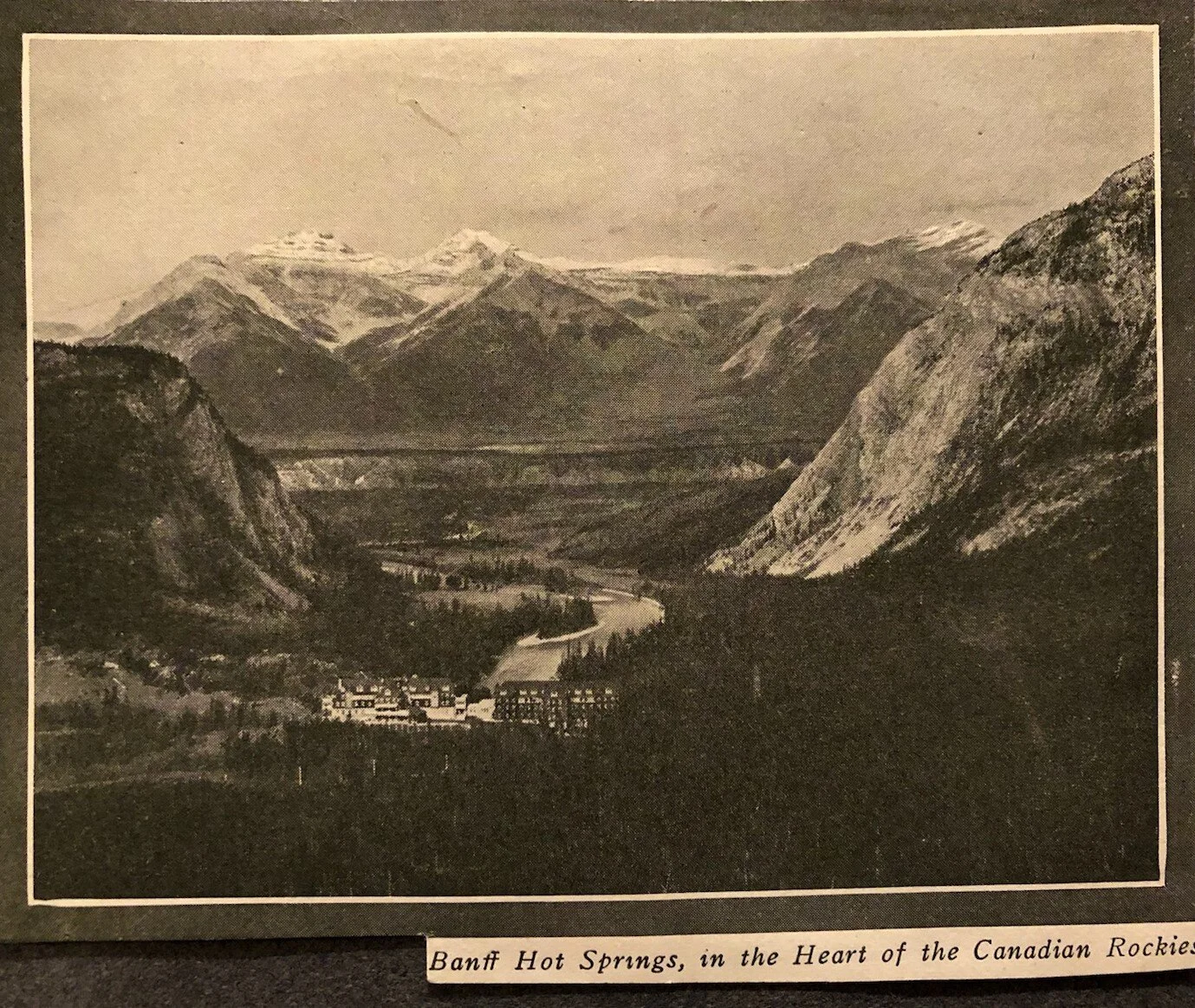 You were filled with indignation and wondered why the lofty tops didn’t fall right down on such puny mockers. How you hurried to dress and how everything caught and hid away! But finally you crawled from between the curtains, hurried to the platform ~ and screamed. There was Banff ~ or rather, there were Banff’s sentinels, piercing the sky and clouds with their glistening tops. It seemed as tho’ you must turn a page, whereon would be the statistics concerning the average annual rainfall of the Canadian provinces, for you had never seen snow peaks before except in pictures. But the lumpy feeling in your throat and the quickened beating of your heart proved that you were gazing at the mountains themselves.